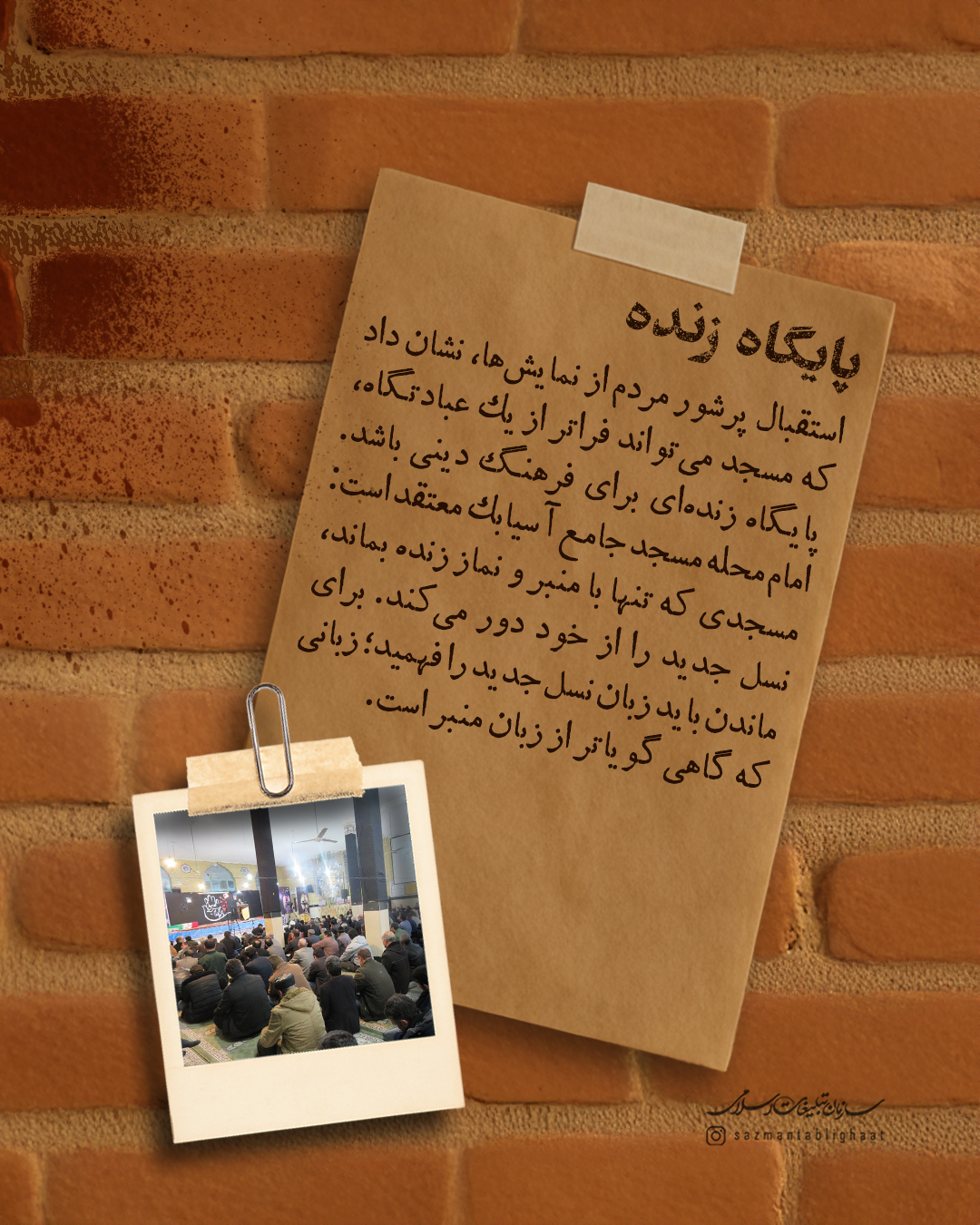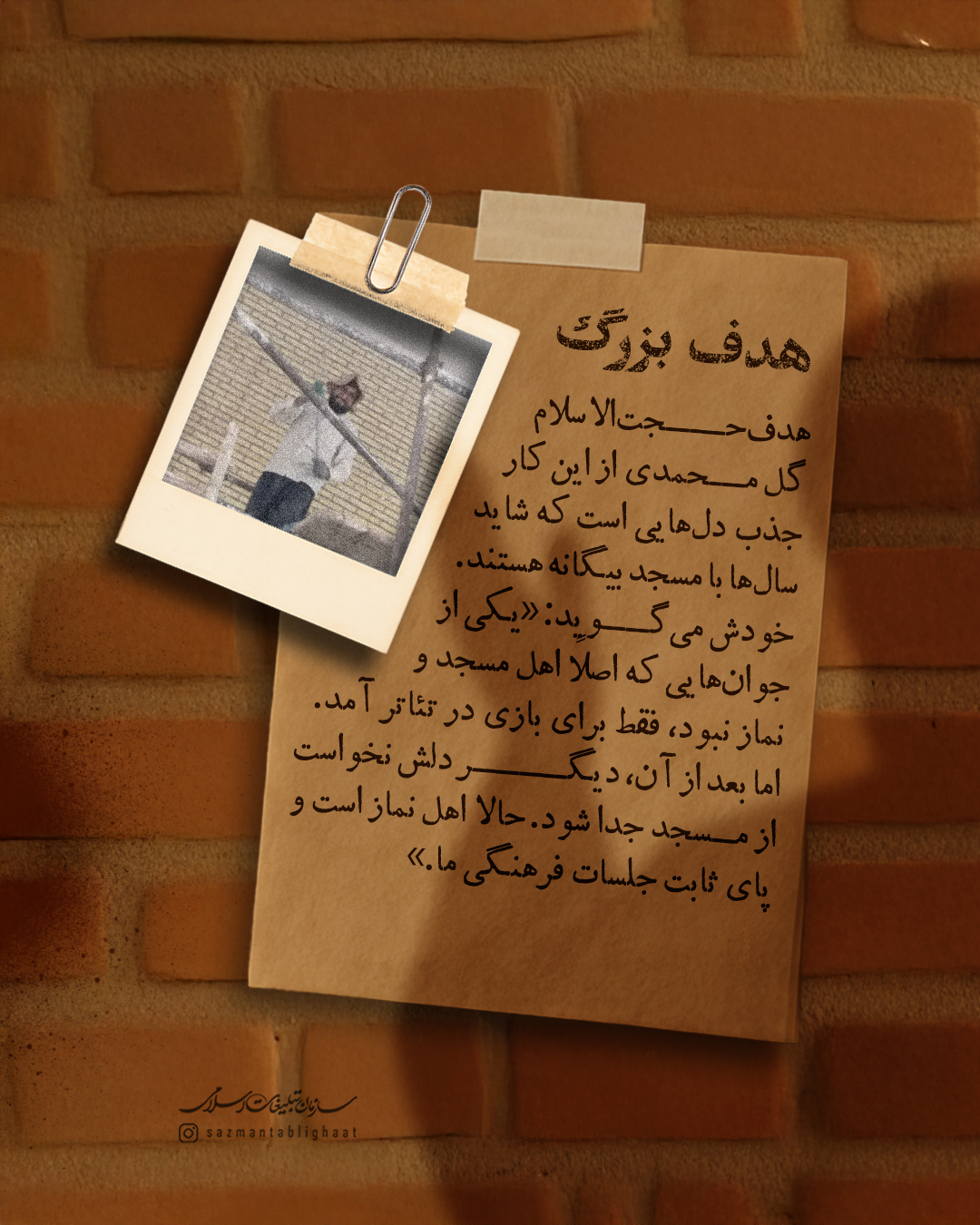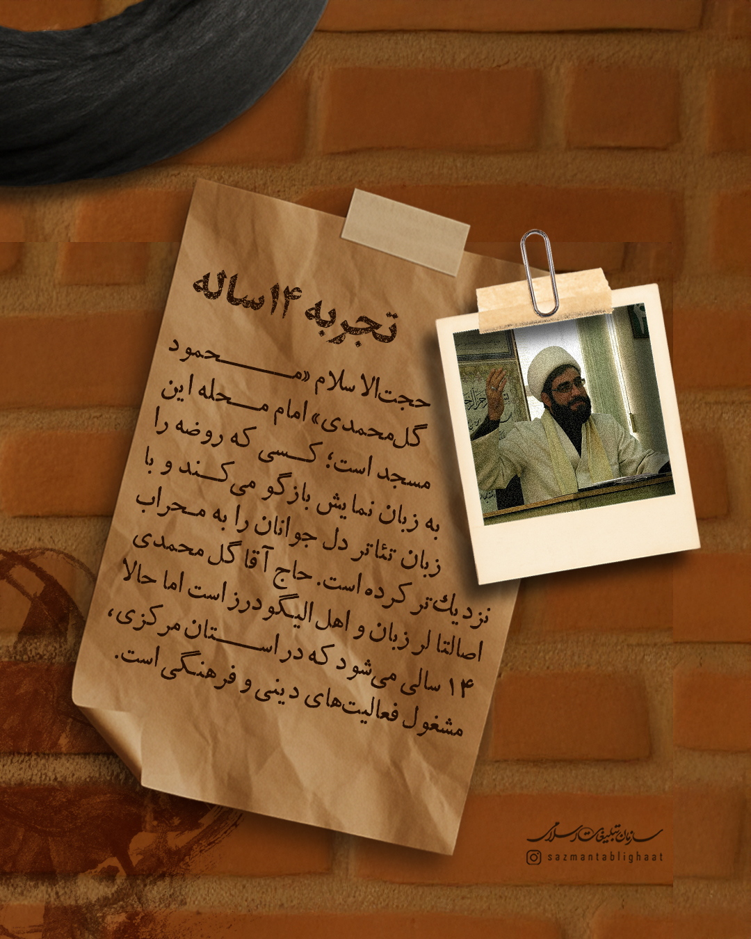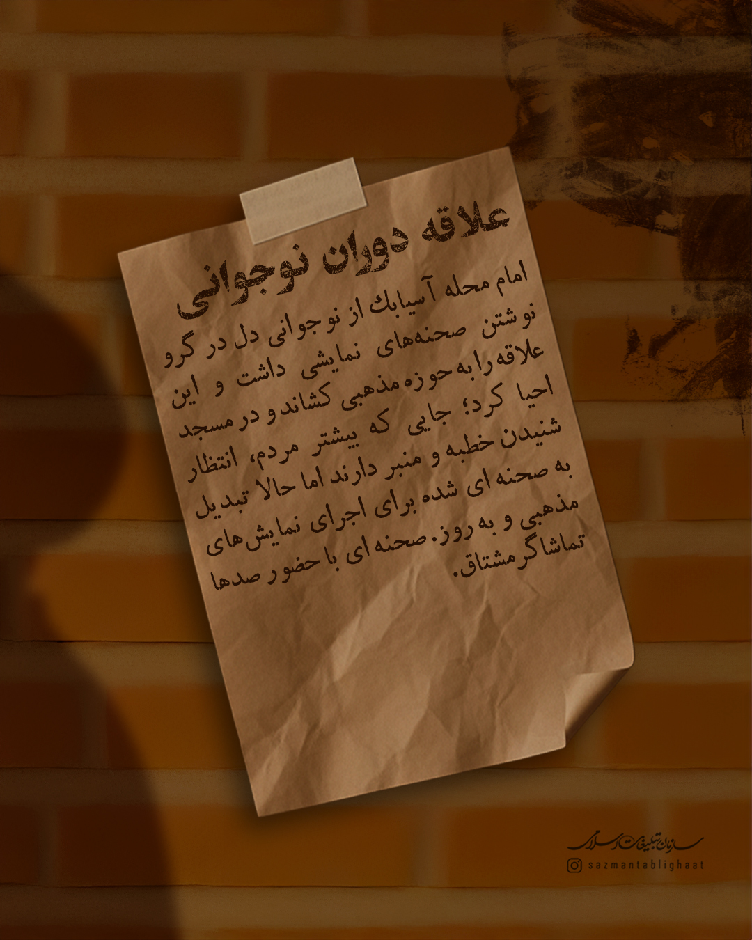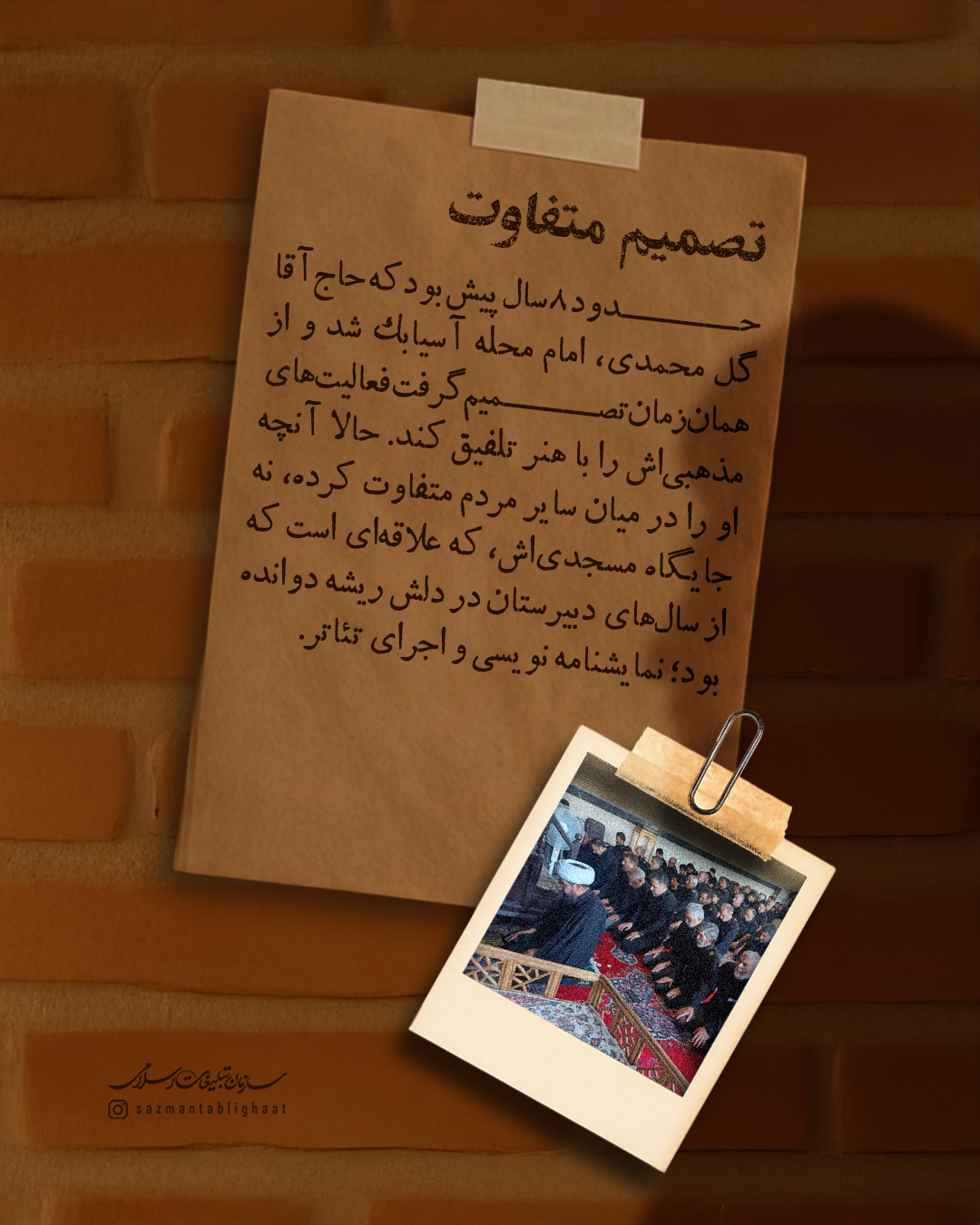 به گزارش روابط عمومی سازمان تبلیغات اسلامی، حجت‌الاسلام «محمود گل‌محمدی» امام محله مسجد جامع آسیابک در شهر زرندیه استان مرکزی است. او که از نوجوانی به ادبیات و نمایشنامه‌نویسی علاقه‌مند بود، با نوشتن نمایشنامه و اجرای نمایش در مسجد تجربه‌ی متفاوتی برای اهالی این محله فراهم کرده است. اتفاقی که منجر به رونق مسجد و حضور فعالانه مردم، خصوصا جوانان و نوجوانان، در مسجد شده است.