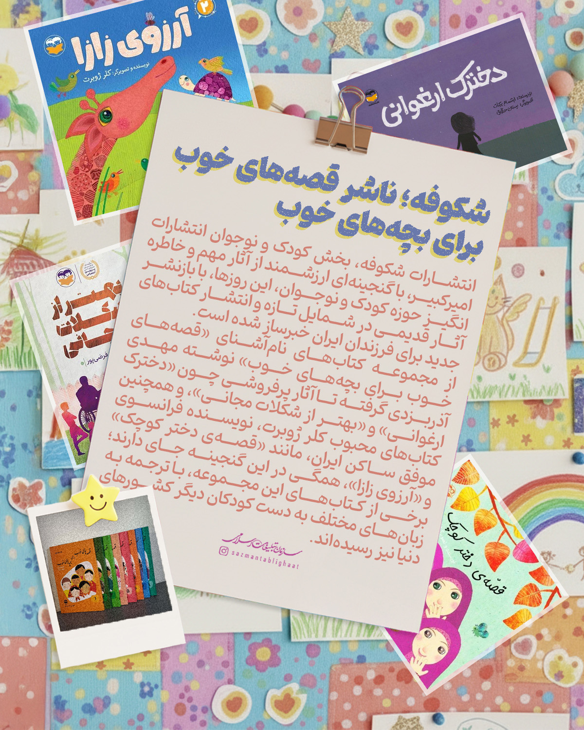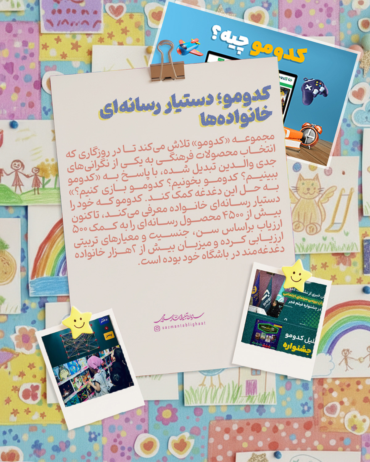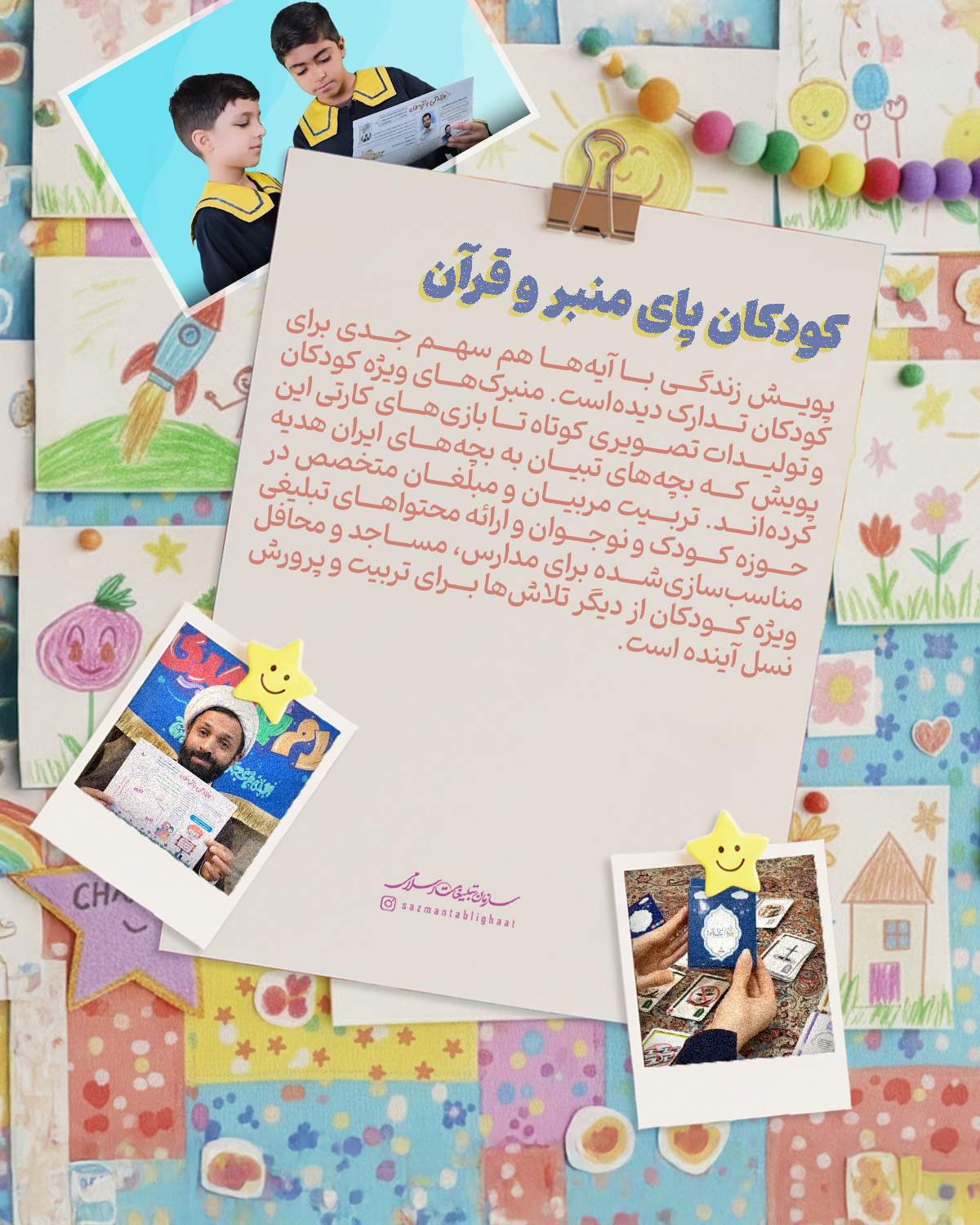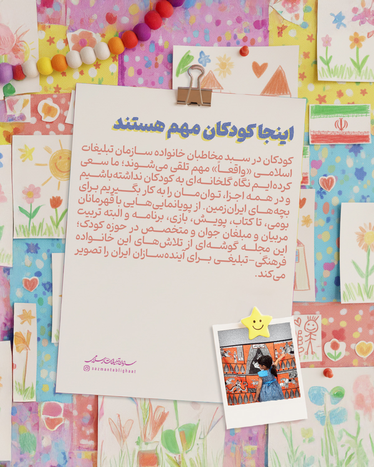 کودکان در سبد مخاطبان خانواده سازمان تبلیغات اسلامی «واقعاً» مهم تلقی می‌شوند؛ ما سعی کرده‌ایم نگاه گلخانه‌ای به کودکان نداشته‌باشیم و در همه اجزا،‌ توان‌مان را به کار بگیریم برای بچه‌های ایران‌زمین. از پویانمایی‌هایی با قهرمانان بومی،‌ تا کتاب، پویش، بازی، برنامه‌ و البته تربیت مربیان و مبلغان جوان و متخصص در حوزه کودک؛ این مجله گوشه‌ای از تلاش‌های این خانواده فرهنگی-تبلیغی برای آینده‌سازان ایران را تصویر می‌کند.