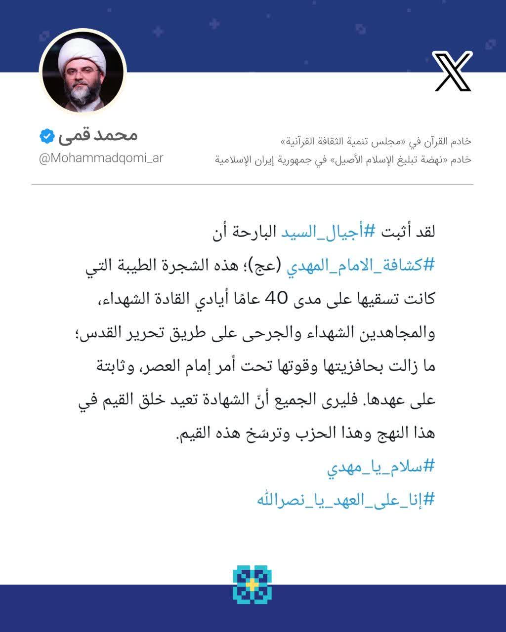 به گزارش روابط عمومی سازمان تبلیغات اسلامی، حجت‌الاسلام محمد قمی، رئیس سازمان تبلیغات اسلامی به مناسبت بزرگداشت اجتماع عظیم و تاریخی گروه‌های پیشاهنگی امام مهدی در تشکیلات حزب‌الله لبنان، که برای سال‌روز چهل‌سالگی این شجره‌ی طیّبه، در ورزشگاه محل بدرقه‌ی پیکر سید شهدای امّت در بیروت برگزار شده بود در صفحه شخصی خود در شبکه اجتماعی ایکس ویژه مخاطبان عرب زبان نوشت؛