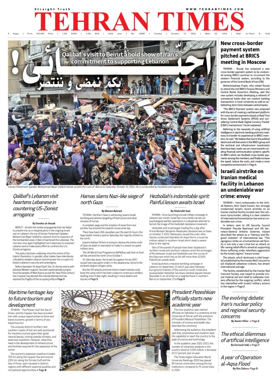 به گزارش روابط عمومی سازمان تبلیغات اسلامی، در پی سفر محمدباقر قاليباف، رئيس مجلس شورای اسلامی كشورمان به بيروت، روزنامه انگليسی زبان تهران تايمز، برای تيتر صفحه نخست خود، عبارتی عربی و به نقل از شهيدسيدحسن نصرالله، دبيركل فقيد حزبالله لبنان را به چاپ رساند.