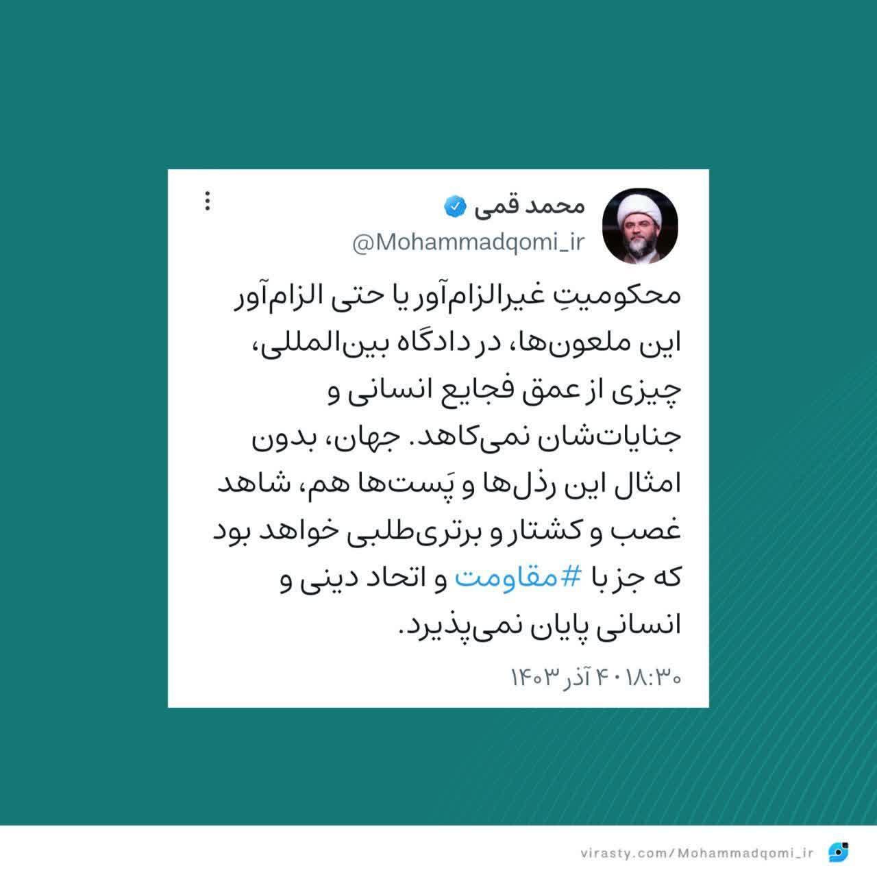 به گزارش روابط عمومی سازمان تبلیغات اسلامی، حجت الاسلام محمد قمی، رییس سازمان تبلیغات اسلامی در واکنش به محکومیت سران رژیم صهیونیستی در دادگاههای بین المللی در صفحه شخصی خود متنی را منتشر کرد.
