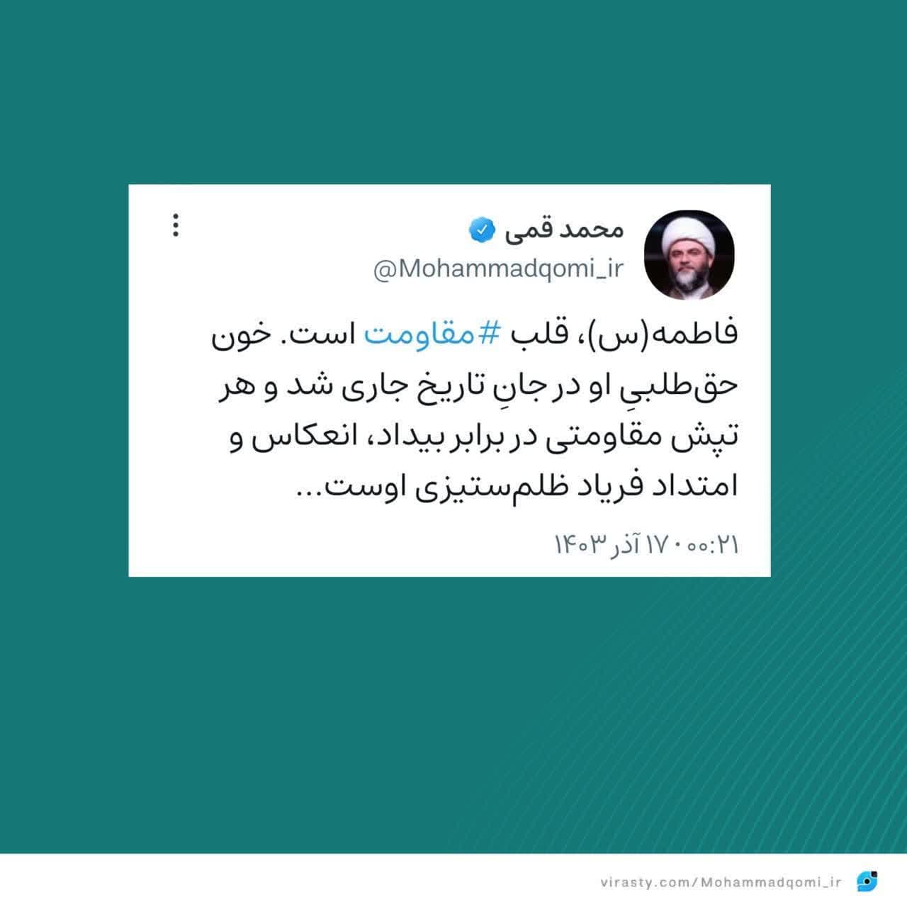 به گزارش روابط عمومی سازمان تبلیغات اسلامی، حجتالاسلام محمد قمی، رییس سازمان تبلیغات اسلامی به مناسبت ایام فاطمیه در صفحه شخصی خود در شبکه ویراستی متنی را منتشر کرد.