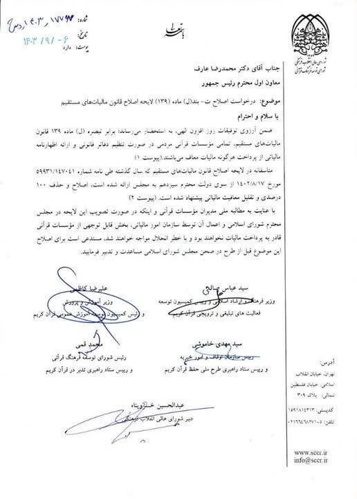 مدیران ارشد فرهنگی و قرآنی کشور طی نامهای از معاون اول رئیس جمهور خواستند تا مؤسسات قرآنی مردمی را از مالیات معاف کنند.