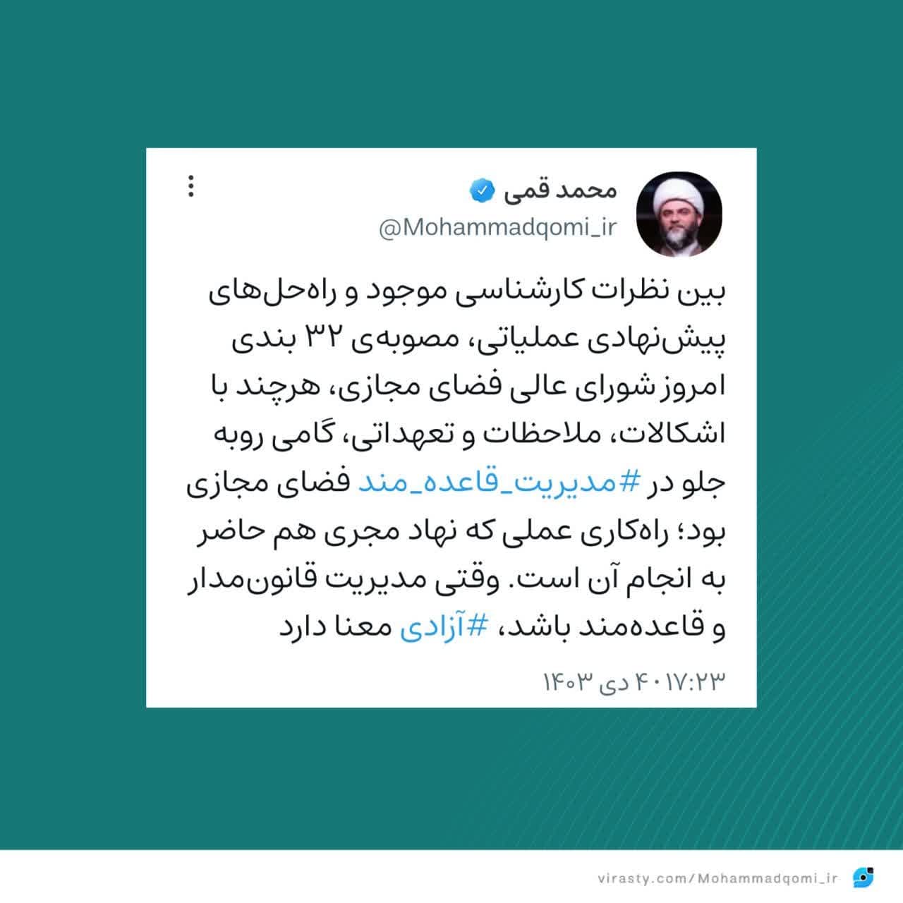 بین نظرات کارشناسی موجود و راهحلهای پیشنهادی عملیاتی، مصوبهی ۳۲ بندی امروز شورای عالی فضای مجازی، هرچند با اشکالات، ملاحظات و تعهداتی، گامی روبه جلو در مدیریت قاعدهمند فضای مجازی بود؛ راهکاری عملی که نهاد مجری هم حاضر به انجام آن است. وقتی مدیریت قانونمدار و قاعدهمند باشد، آزادی معنا دارد.