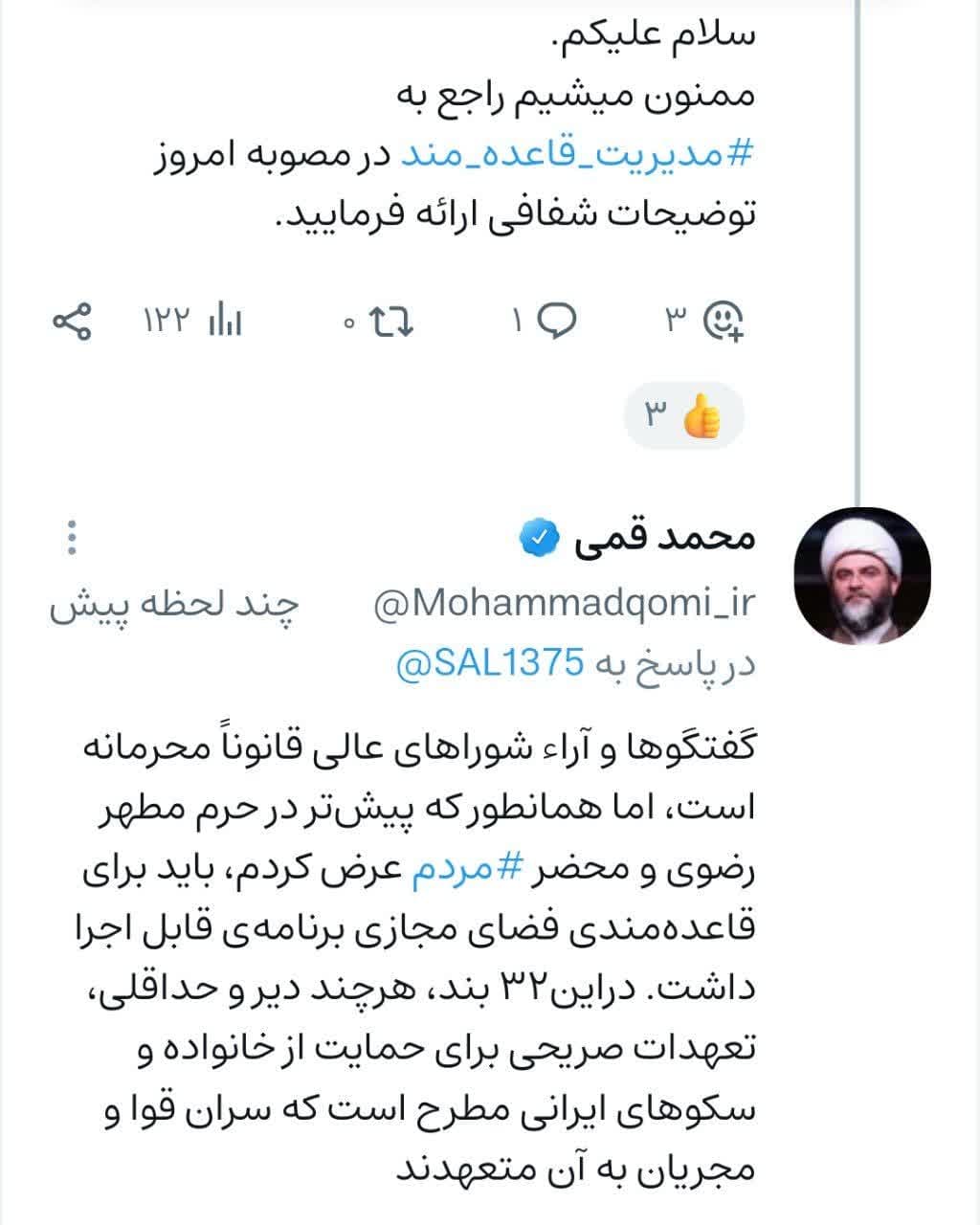 حجتالاسلام قمی در پاسخ نوشت، گفتگوها و آراء شورای عالی قانونا محرمانه است، اما همانطور که پیشتر در حرم مطهر رضوی و محضر مردم عرض کردم، باید برای قاعدهمندی فضای مجازی برنامه قابل اجرا داشت.در این 32 بند، هرچه دیر و حداقلی، تعهدات صریحی برای حمایت از خانواده و سکوهای ایرانی مطرح است که سران قوا و مجریان به آن متعهدند.