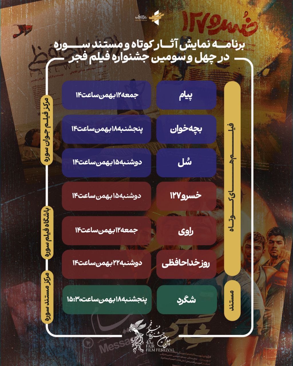 به گزارش روابط عمومی سازمان تبلیغات اسلامی، فیلمهای کوتاه «بچهخوان»، «سُل» و «پیام» از آثار مرکز فیلم جوان سوره، «خسرو ۱۲۷»، «راوی» و «روز خداحافظی» از آثار باشگاه فیلم سوره و مستند «شگرد» اثر مرکز مستند سوره در بخش مسابقه چهلوسومین جشنواره فیلم فجر حضور دارند.