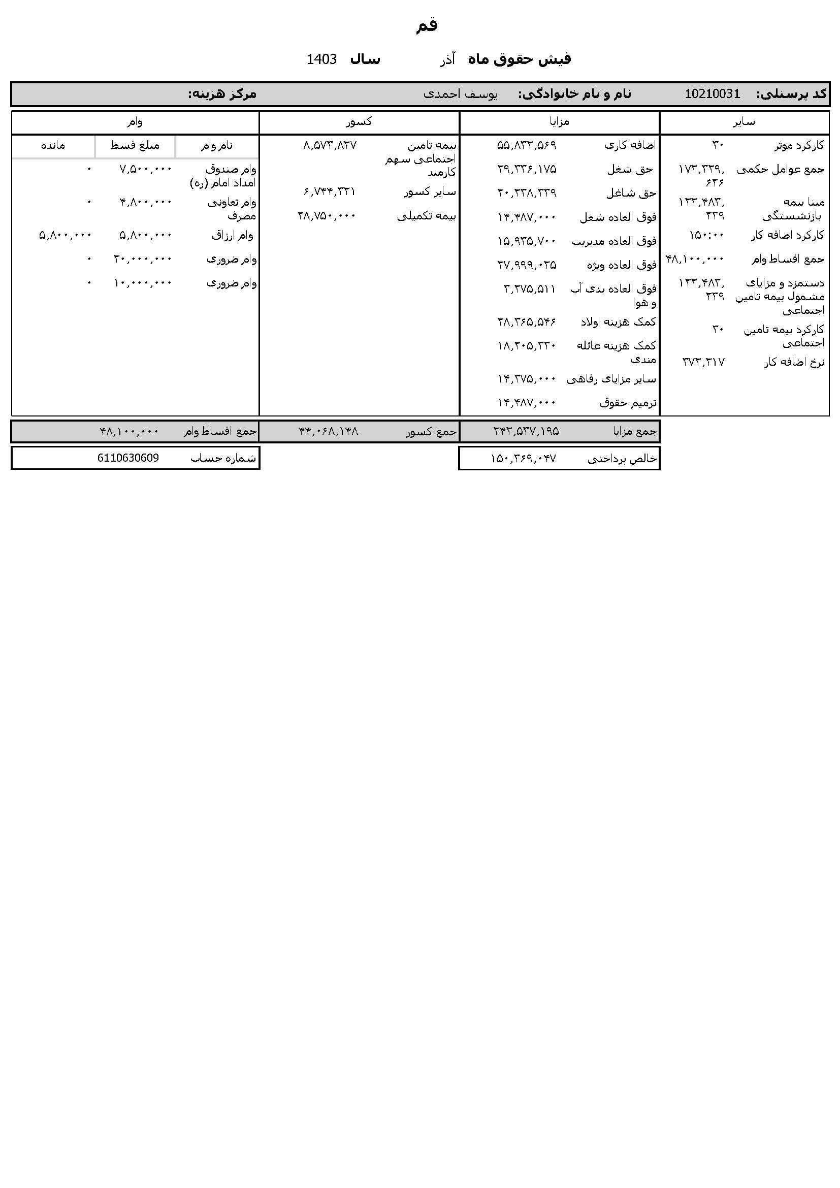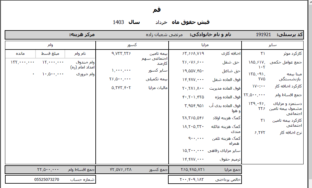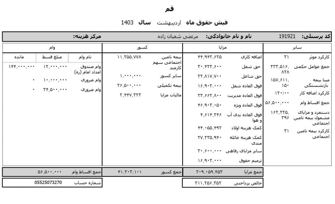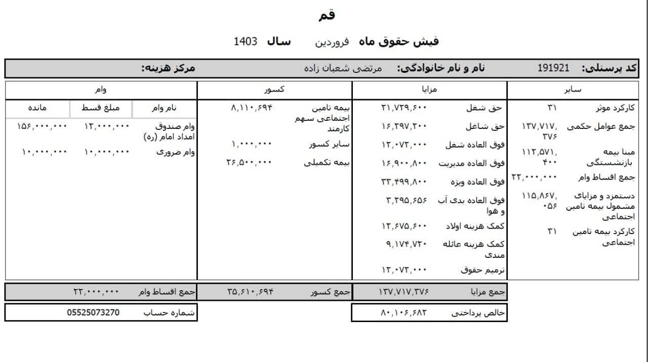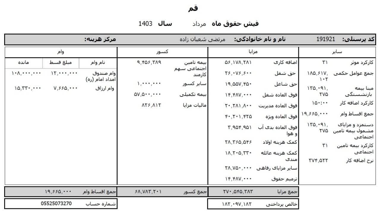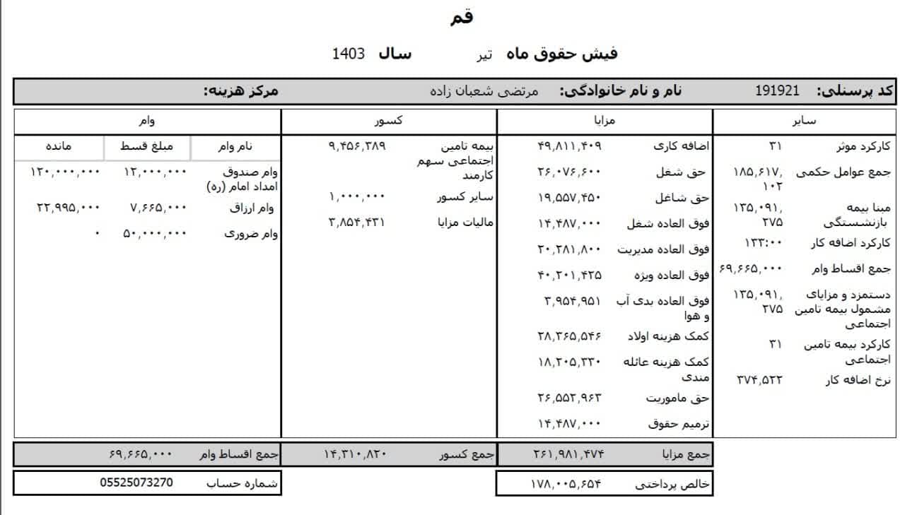 به گزارش روابط عمومی سازمان تبلیغات اسلامی، حقوق عمومی اطلاعات حقوق و مزایای 12 ماهه حجت الاسلام والمسلمین مرتضی شعبانزاده مدیر کل تبلیغات اسلامی استان قم و فیش حقوقی 12 ماهه حجت الاسلام والمسلمین یوسف احمدی معاون اداری و مالی منتشر شد.