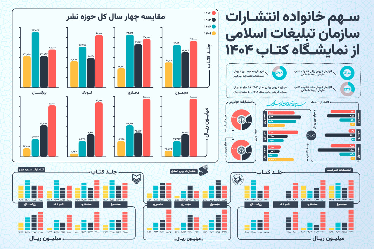 به گزارش روابط عمومی سازمان تبلیغات اسلامی، مجدالدین معلمی، مدیرعامل بنیاد کتاب، گفت: «خانواده نشر سازمان تبلیغات اسلامی در نمایشگاه کتاب ۱۴۰۴، با فروش ۹۷ هزار جلد کتاب، رشد ۳۴ درصدی در فروش تعداد جلد کتاب را نسبت به سال گذشته تجربه کرد. فروش ریالی خانواده نشر سازمان تبلیغات اسلامی نیز با رشد ۱۰۰ درصدی معادل ۲۰ میلیارد تومان بود.»