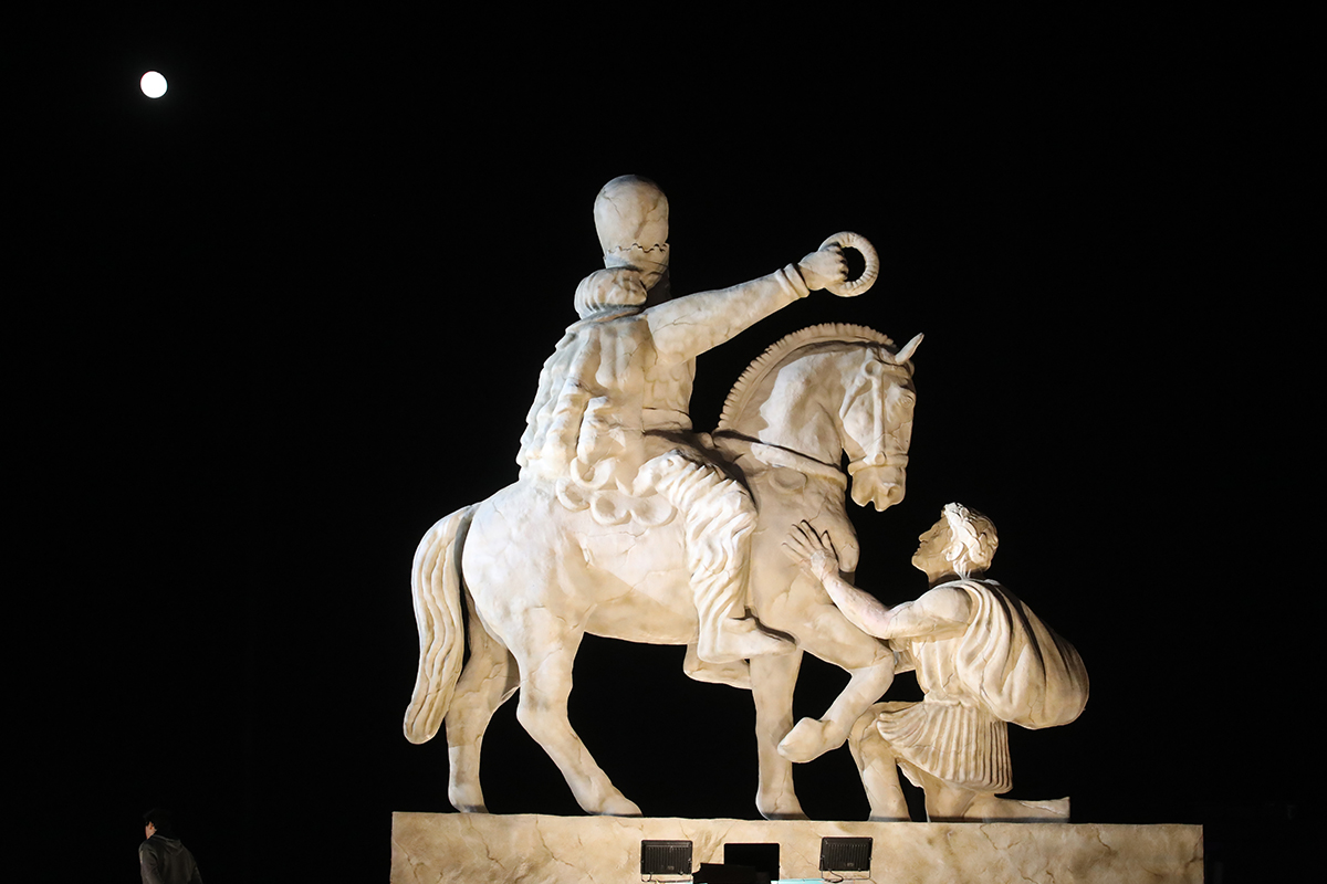 این رویداد فرهنگی و هنری به مناسبت رونمایی از مجسمه «زانو زنندگان برابر ایران» ساخته پیام قانع برگزار شد. این مجسمه هفت متری از جنس فایبرگلاس، روایتی از اقتدار تاریخی ایرانیان را به تصویر میکشد، زمانی که والرین، پادشاه روم، پس از حمله به ایران، در برابر پادشاه ساسانی تسلیم شد و زانو زد. در پایه مجسمه ۱۳ پرده جانمایی شده است که هرکدام مقطع مهمی از مقاومت ایرانیان در برابر بیگانگان را نشان میدهد؛ از پایداری در برابر حملات اسکندر تا مقابله با استعمار، جنگ تحمیلی و پیروزی بر داعش. این مجسمه به مدت ۲۰ روز در میدان انقلاب خواهد بود و سپس به میدان آزادی منتقل میشود.